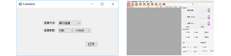 打开ReaderDemo.exe,选择连接读写器-设备连接。